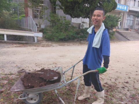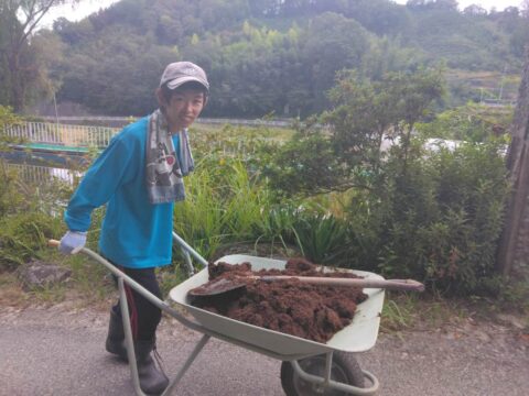 牛糞や、尾道ファーム様より頂いた大量のすくもを一輪車に積み込み