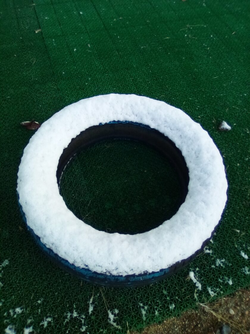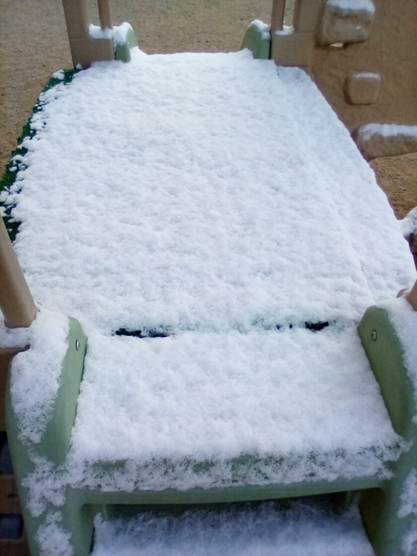 先日、初雪を観測しました。園庭のタイヤや遊具にも少し積雪もありました⛄そんな寒さの中でも、こどもたちは元気です😊