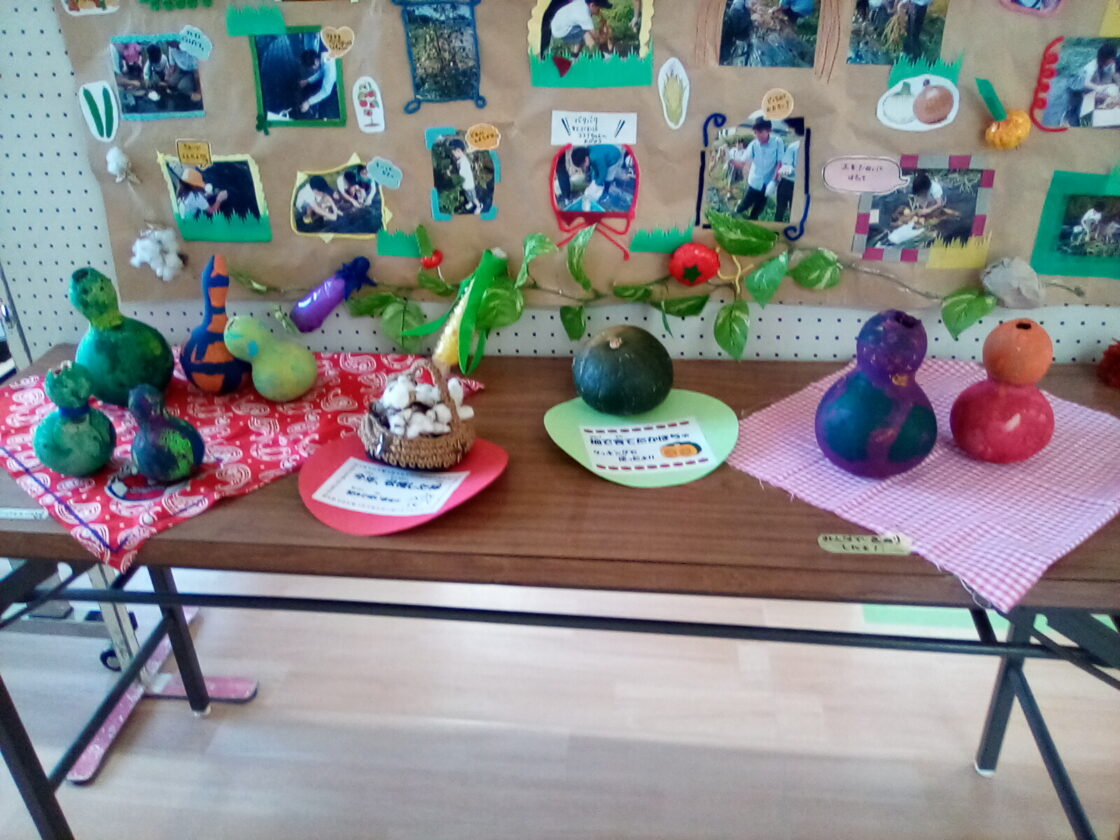 続いて、畑での活動風景と、収穫したかぼちゃにひょうたん、わた...。