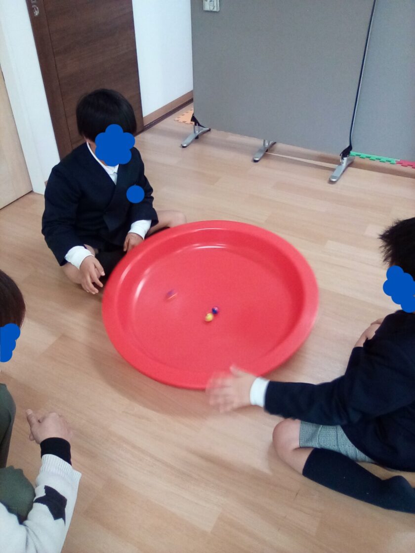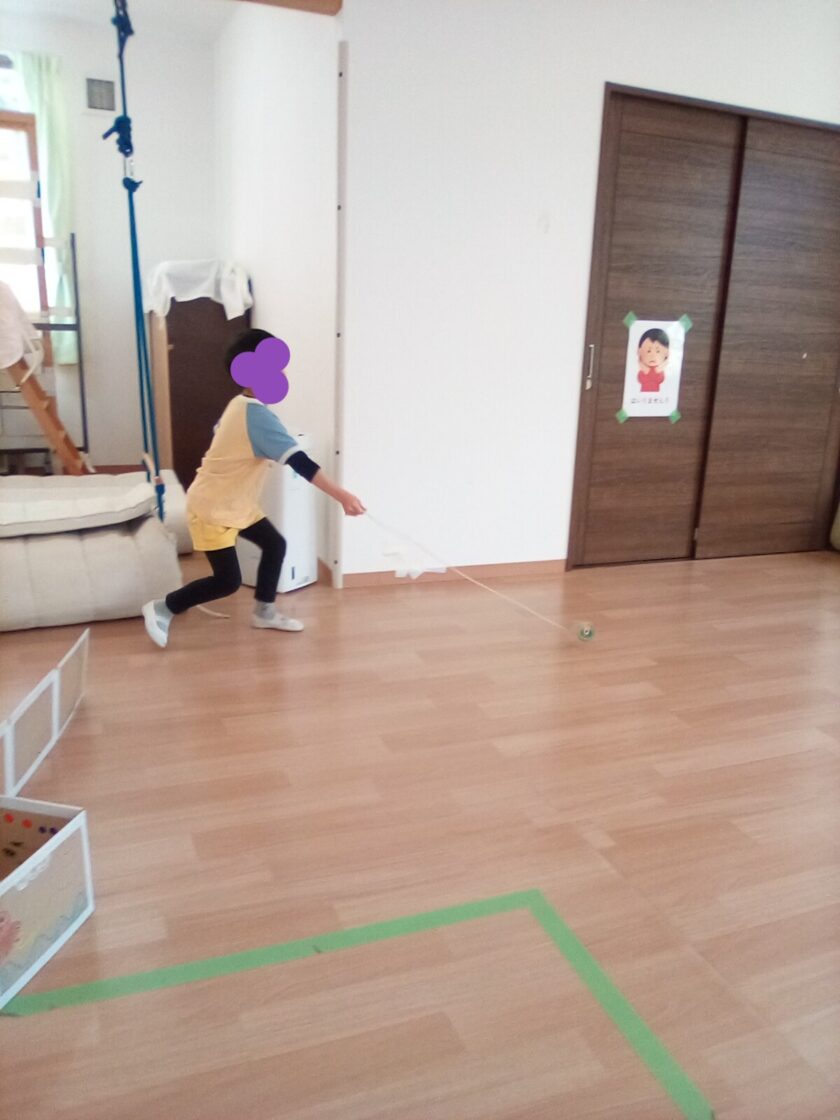 こま回し...少しずつコツをつかみ、回せた時には嬉しそうな顔を見せてくれました。