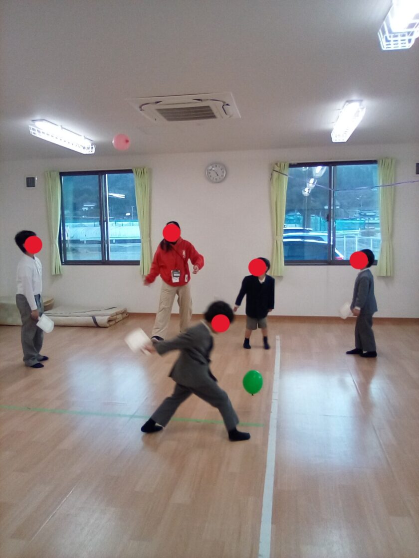 羽根つき(風船付き)...風船の動きに集中し元気いっぱい遊べました。体を動かす楽しさを感じることが出来ました。