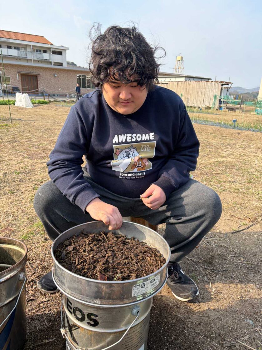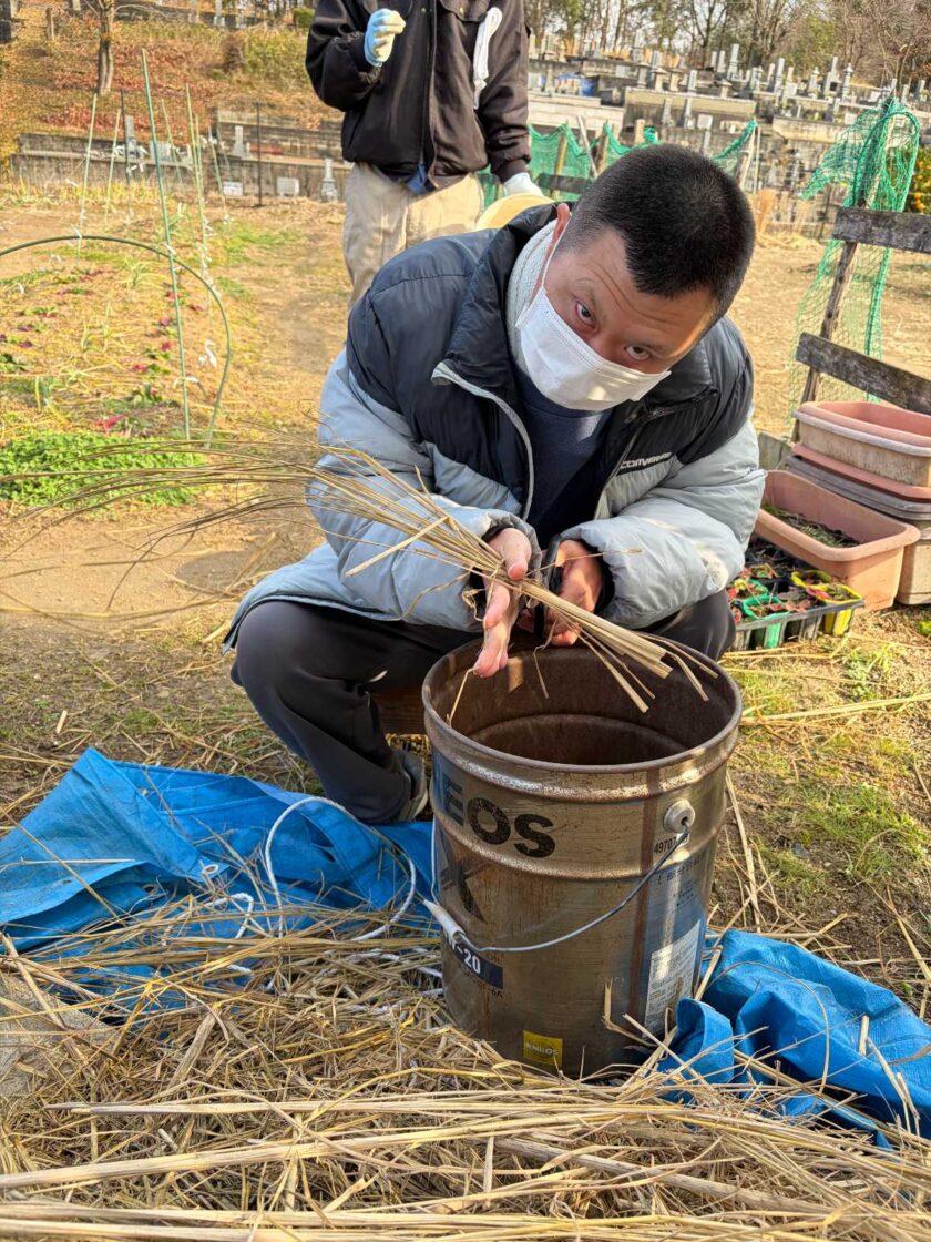 切った藁などを混ぜ飲んで土づくりを行なっています。
