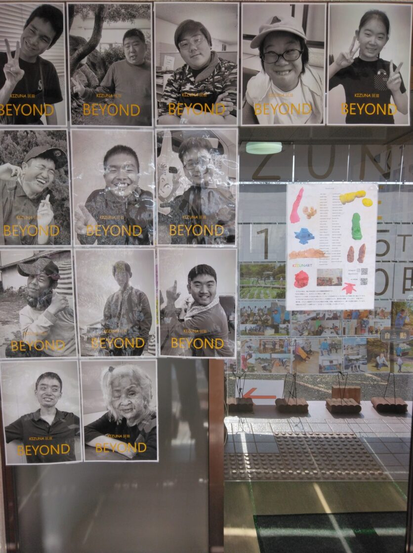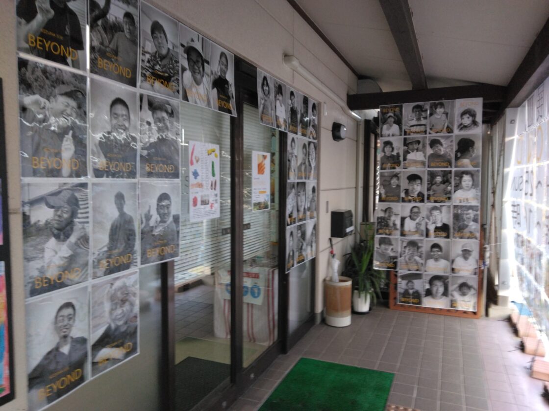 ▲きずなの里のご利用者さまのソロ写真でお客様をお出迎え