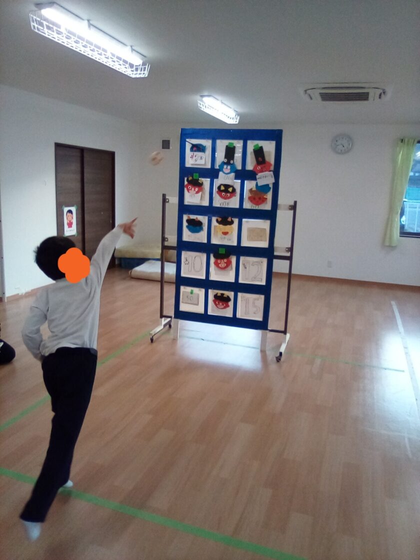 節分...みんなで鬼をやっつけました。まずは、鬼の的をめがけて練習です。
