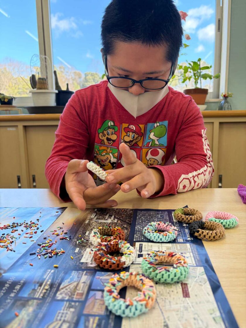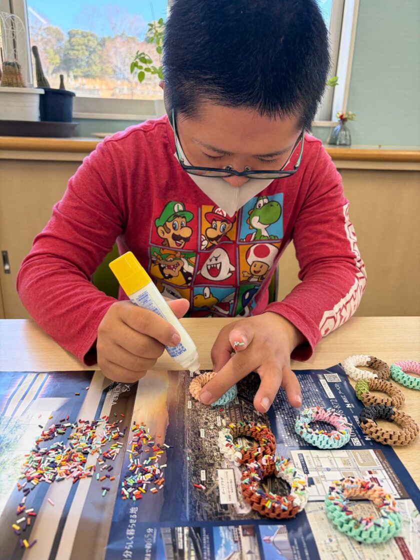 カラースプレー(カラフルな砂糖)を張り付けているところです🍩