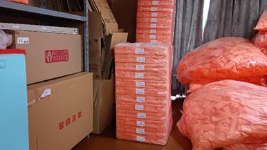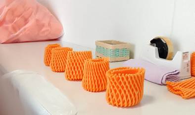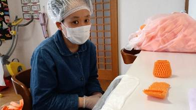 内職事業部ではフルーツキャプと呼ばれる、果物を保護するクッション性のある網状の緩衝材扱う作業をしています。