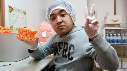 「今度のフルーツキャップも小さいので難しいですが、速く折るのが得意です!」