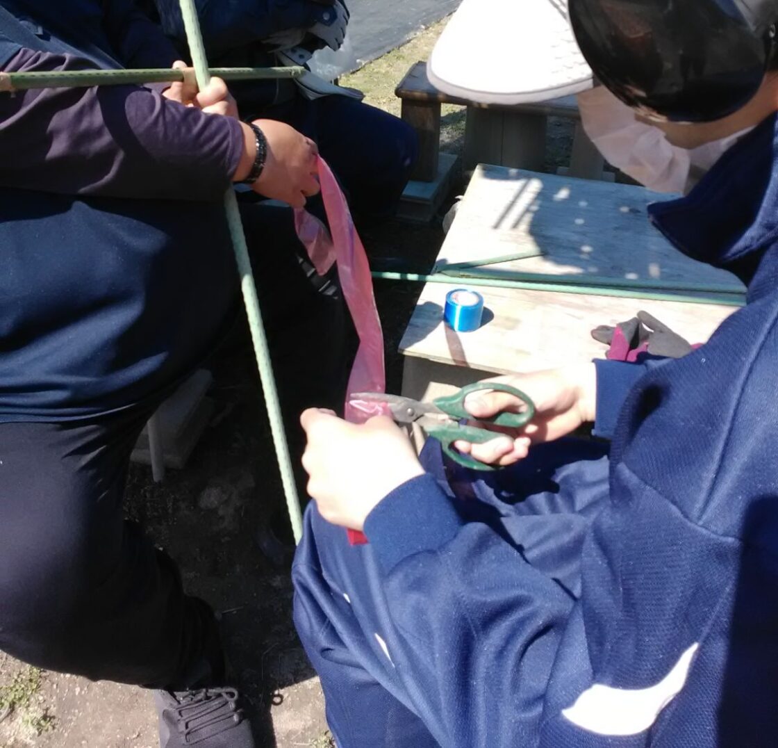 新聞を丸めたり、ビニール袋をくっつけたりと、色々工程を経て