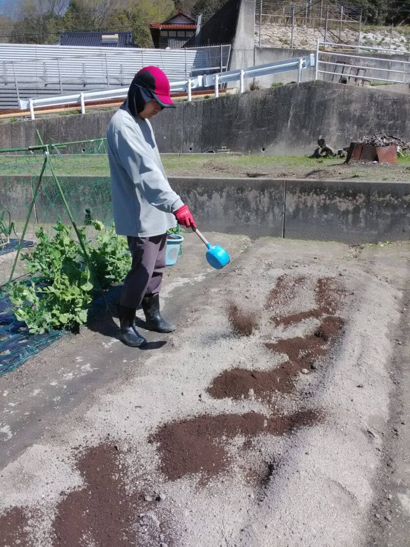 石灰を撒いて一週間待ち、今回は牛ふん撒き。