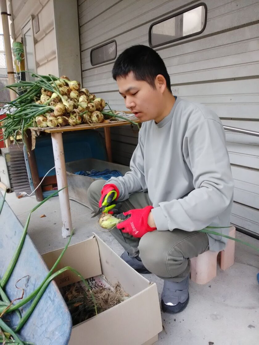 収穫後は、葉や根っこを切って紐で縛り吊るします。