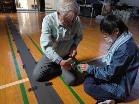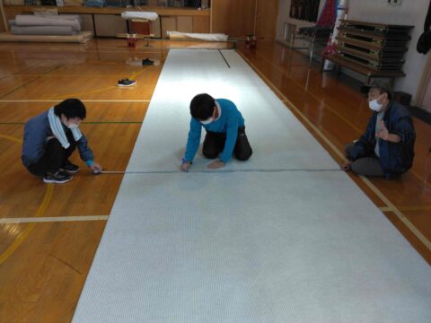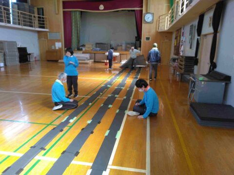 皆で協力して体育館に専用のレーンを作るところから始めます