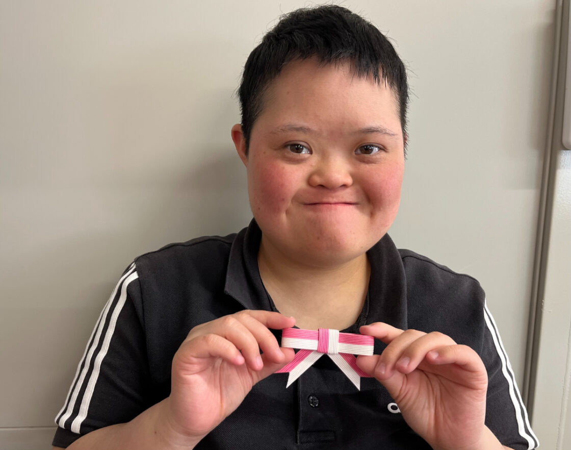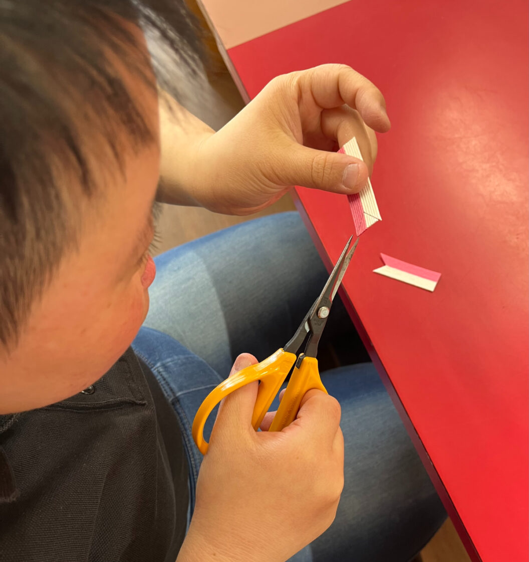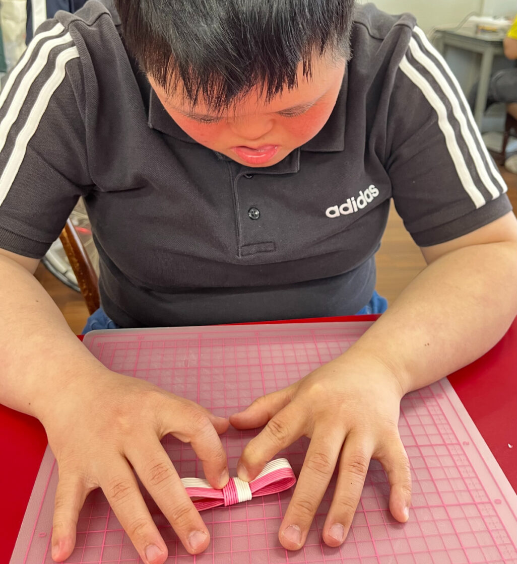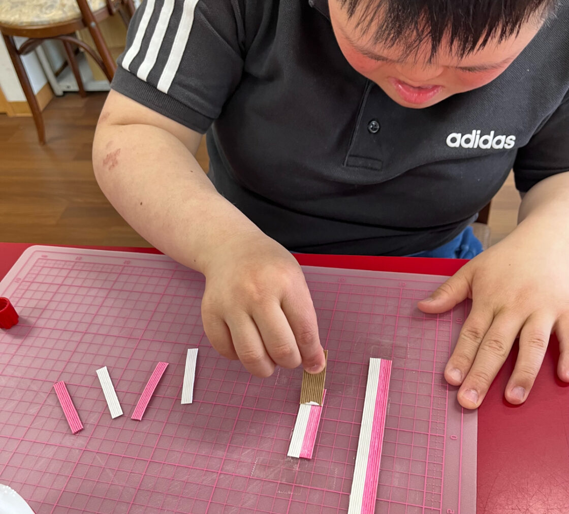 この春、3年を過ぎて4年目に入った利用者さんの、リボン作りです。