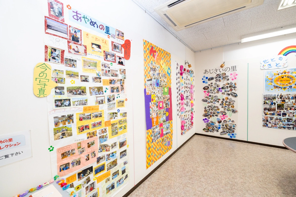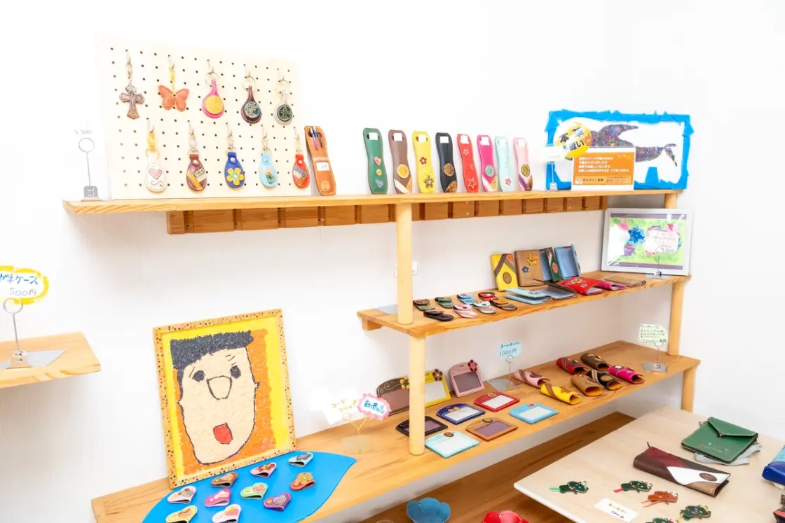 ギャラリー若菜では、カフェの営業(カレー、ドリンクの提供)、レザー商品を作り販売しています。 その他にも、美術活動に特化して作業に取り入れています。毎年、各施設の芸術展を定期開催しており、ご利用者が日々取り組んで来られた、作品の数々を展示し、沢山の方々に「若菜」を知って頂ける機会を励みに頑張っています。