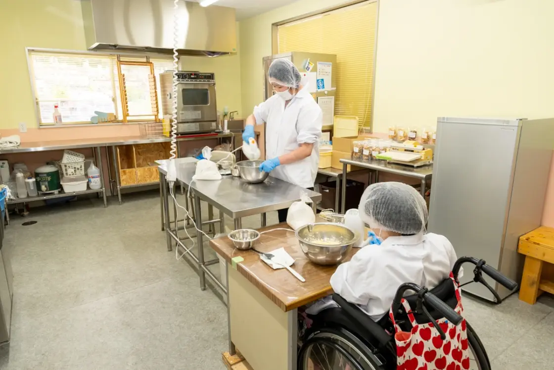 食品加工作業では、クッキーやパウンドケーキを作っています。材料の計量から生地作り、型抜き、焼成、袋詰めなど全ての工程をご利用者様に行ってもらっています。作ったクッキーやパウンドケーキはJA産直市や特別支援学校へ納品に行ったり、注文を受けて誕生日ギフトセットとして販売したりしています。