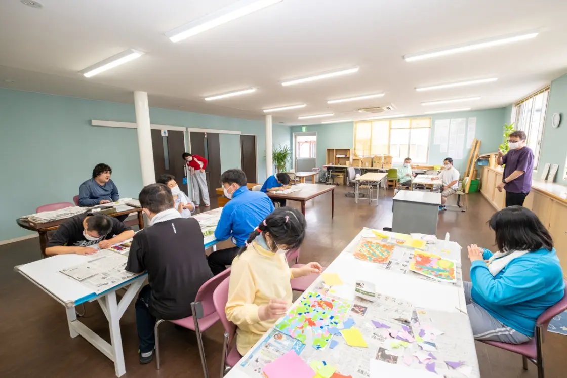 施設内の作業では、クラフトテープを編んでカゴやバッグなどを制作したり、刺し子を行う創作活動や、施設の机や椅子などの施設備品からオーダーメイド家具まで色々手作りで制作する木工作業、様々な画材を使用してアート制作を行い、完成した作品を公募に応募したり、芸術展に出品する芸術活動など多岐にわたる仕事があります。