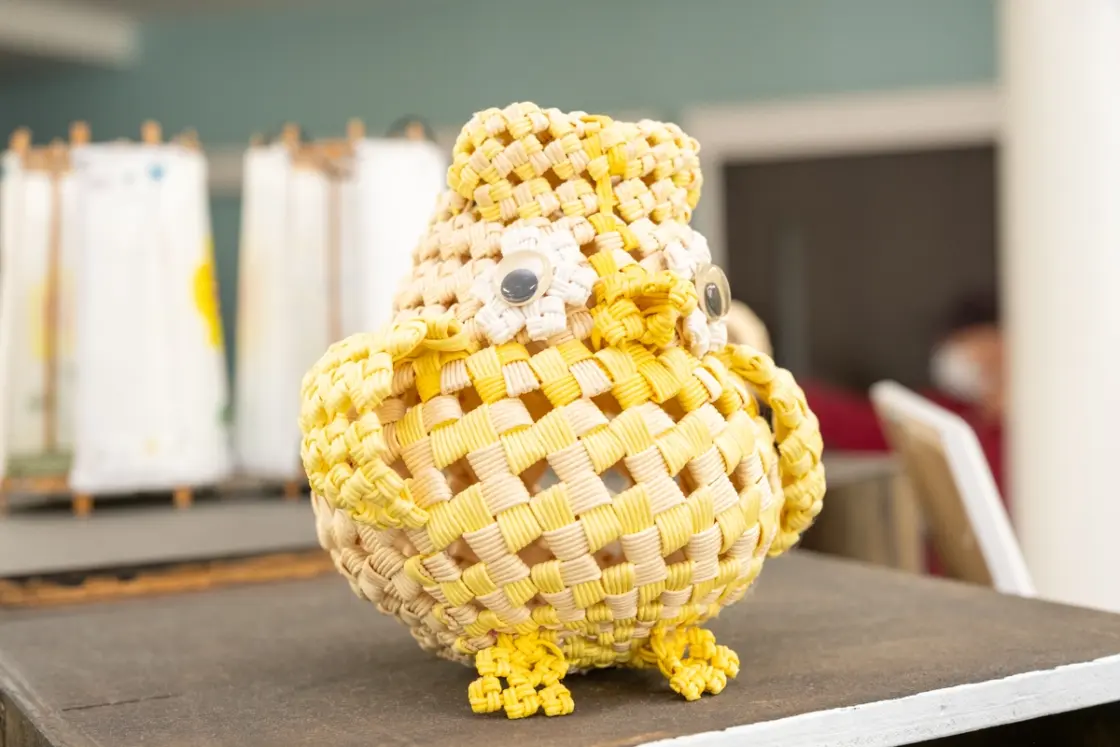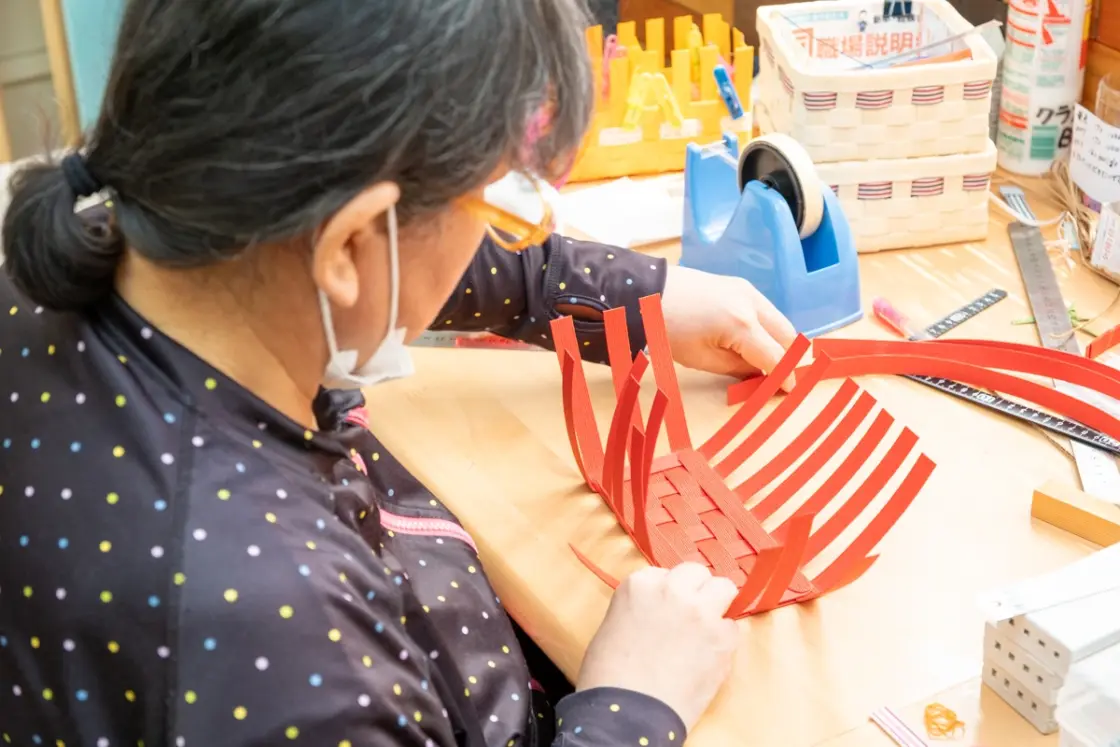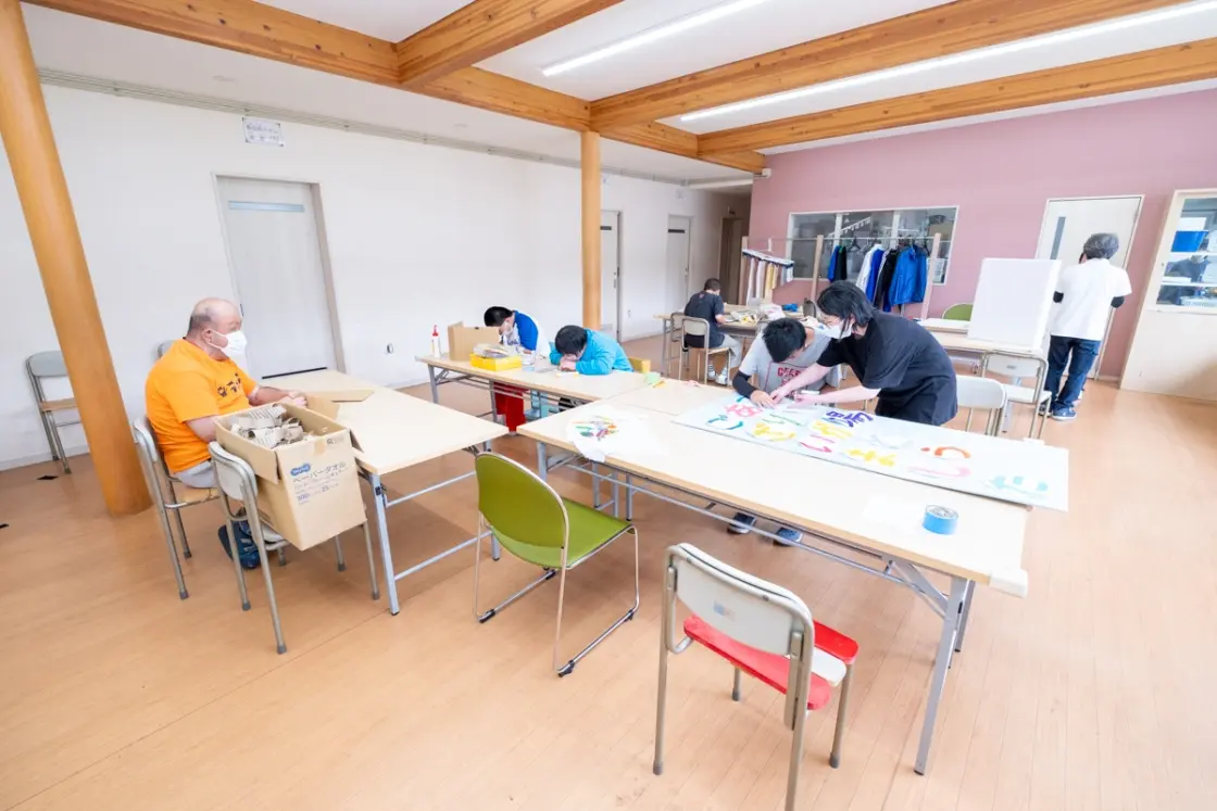 施設内の作業では、クラフトテープを編んでカゴやバッグなどを制作したり、刺し子を行う創作活動や、施設の机や椅子などの施設備品からオーダーメイド家具まで色々手作りで制作する木工作業、様々な画材を使用してアート制作を行い、完成した作品を公募に応募したり、芸術展に出品する芸術活動など多岐にわたる仕事があります。