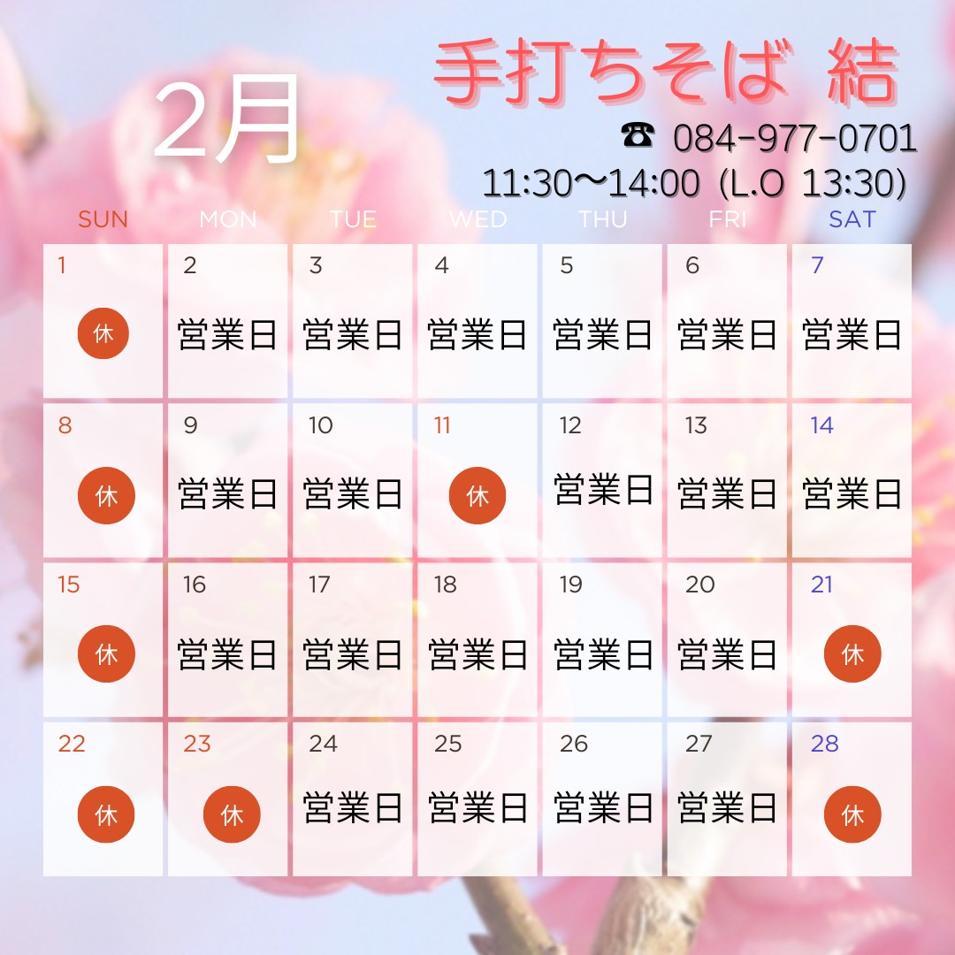 手打ちそば結の2月の営業日のお知らせです。