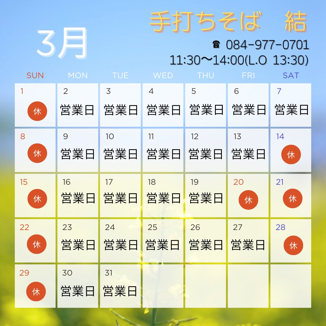 手打ちそば結の3月の営業日のお知らせです。
